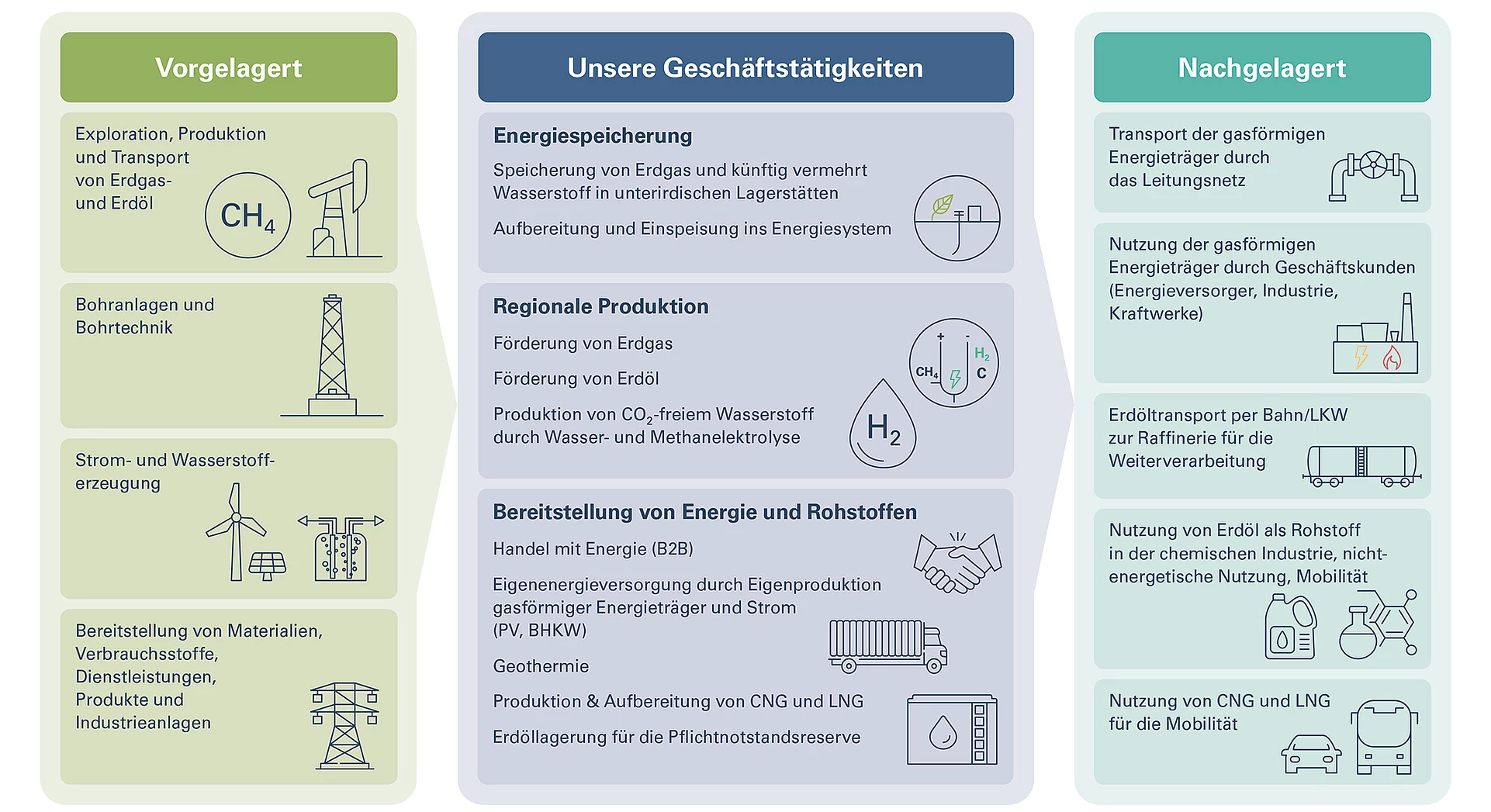 Nachgelagert schließt die Wertschöpfungskette den Transport von Rohöl, Erdgas und Wasserstoff per Bahn und Pipeline sowie die Weiterverarbeitung und die Nutzung dieser Energieträger durch unsere Geschäftskund*innen ein. Weiters betreibt die RAG öffentliche CNG- und LNG-Tankstellen zur Nutzung für die Mobilität durch Endkunden.
