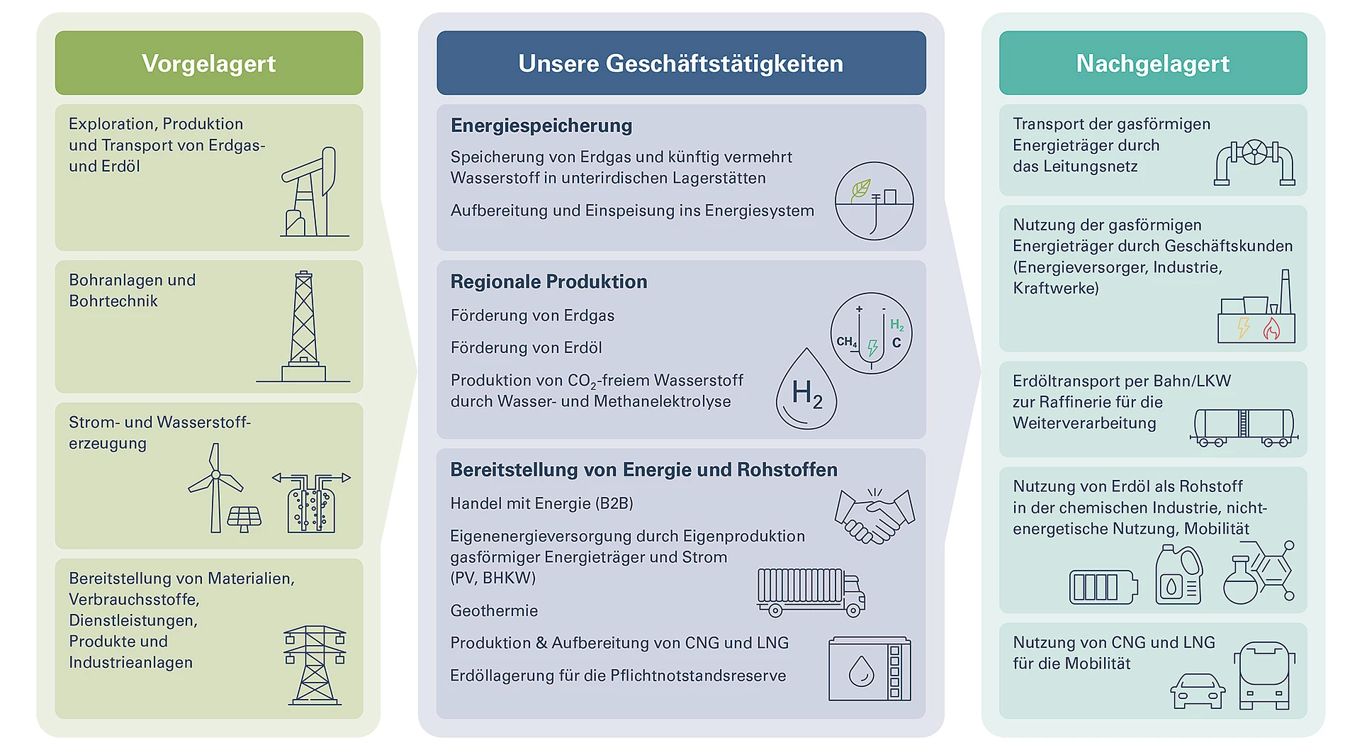 Die direkte Wertschöpfungskette beinhaltet die Produktion, Aufbereitung, Speicherung und Einspeisung ins Energiesystem sowie den Handel und Verkauf von Rohöl und gasförmigen Energieträgern wie Erdgas und Wasserstoff. Die RAG produziert in Österreich Erdölmengen - mit einem entsprechend geringen CO2-Fußabdruck im Vergleich zu internationalen Erdöl-Importen - welche national vermarktet werden. Die produzierten Erdgasmengen in Österreich verringern, wenn auch nur geringfügig, den Importbedarf von Erdgas. Durch die Anbindung des Leitungsnetzes der RAG an Süddeutschland wird auch der süddeutsche Markt sowie die nur über Deutschland erreichbaren Regelzonen Vorarlberg und Tirol versorgt. Ein besonderer Fokus liegt dabei auf der sicheren Bereitstellung von Speicherkapazitäten, die als Teil der kritischen Infrastruktur wesentlich zur Versorgungssicherheit von Gesellschaft und Industrie beitragen. Als Betreiber eines Tanklagers für Rohöl in Oberösterreich ermöglicht die RAG außerdem Rohöl- sowie Mineralölimporteuren ihre gesetzlich vorgeschriebene Notstandsreserve zu bevorraten.